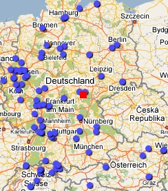 OK, OK, logischerweise habe ich nur die bei frappr registrierten Nutzer berücksichtigen können und ich habe da weder den Mittelpunkt zwischen allen Schnittlinien genommen oder gewertet oder was, einfach stumpf ein Rechteck um alle Punkte und davon die Mitte genommen.